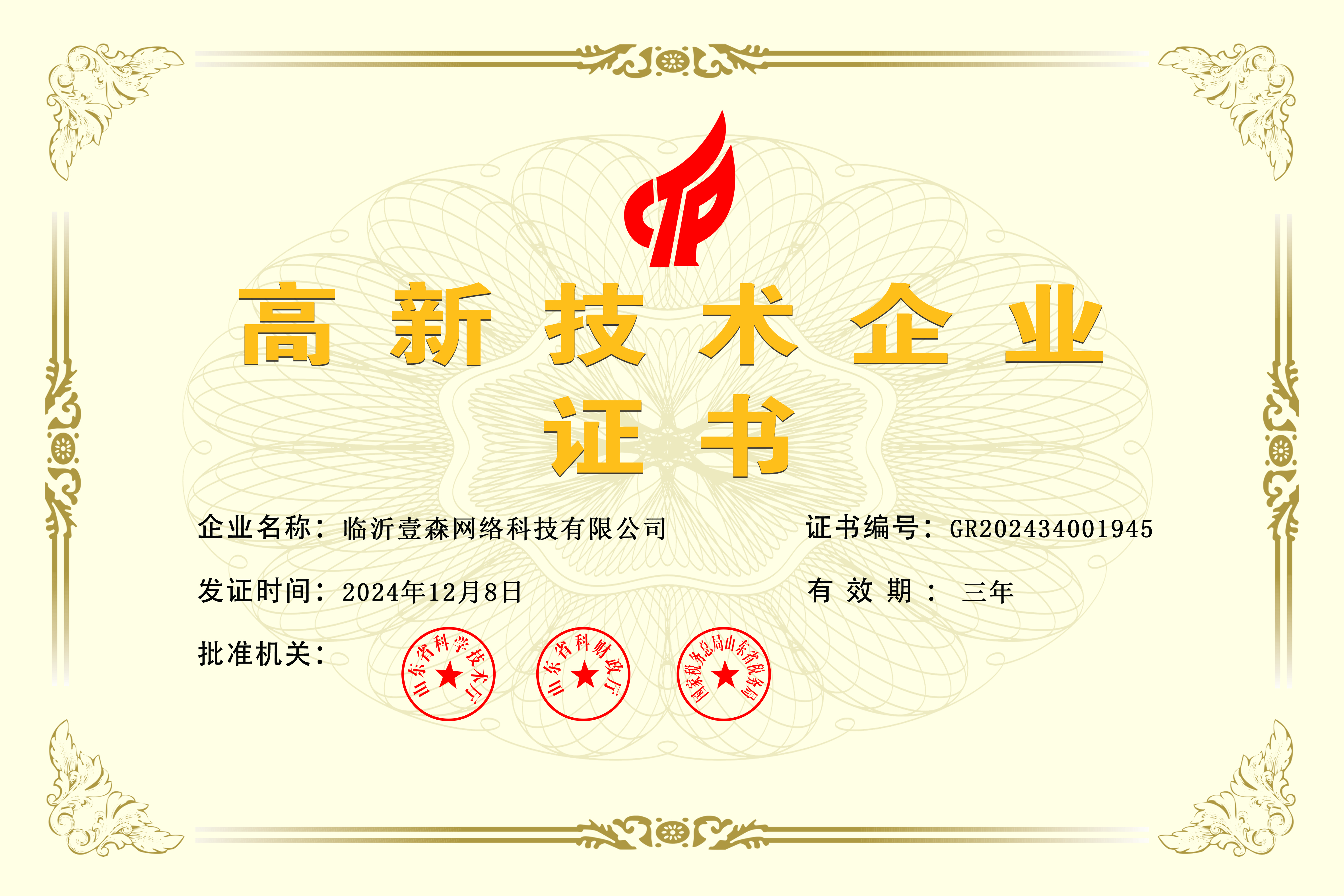 高新技术企业证书