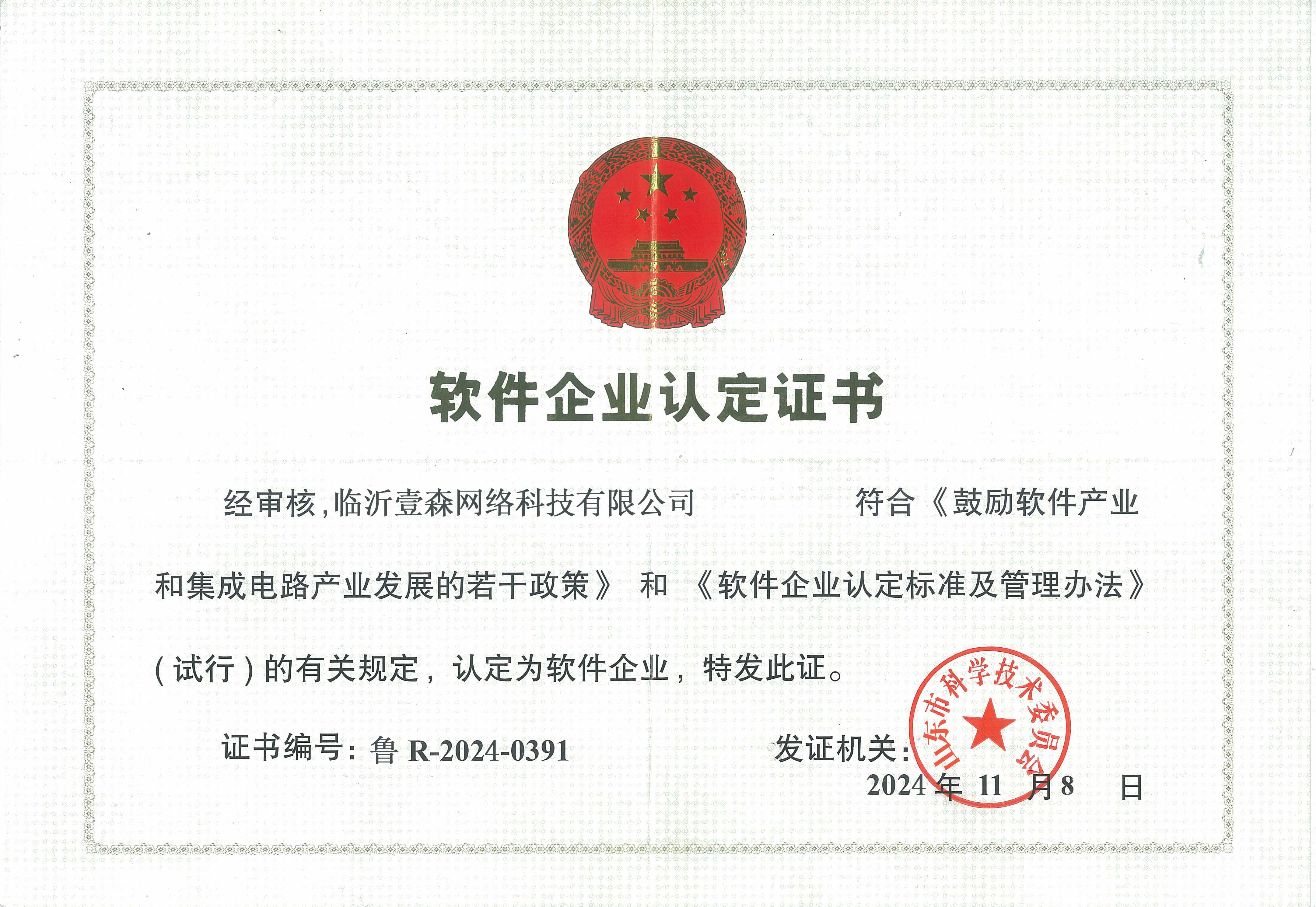 软件企业认定证书